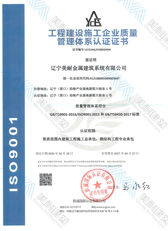 遼寧美耐金屬建筑系統有限公司位于遼寧(營口)沿海產業(yè)基地,專注于預制金屬建筑系統領域,是一家集工業(yè)建筑設計、制作、施工及相關的技術咨詢與服務為一體的綜合性服務企業(yè)。作為國家鋼結構協會會員、中國建筑金屬結構協會會員單位與國家高新技術企業(yè),美耐建筑集建筑工程施工總承包、鋼結構工程專業(yè)承包等多種資質于一身,并擁有22項鋼結構建筑領域專利,9項軟件著作權。